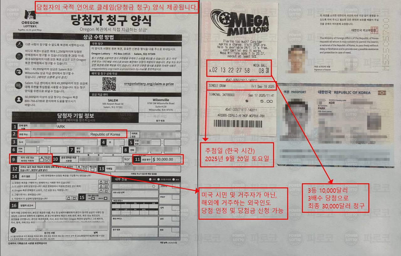 미국을 직접 방문하시지 않고 파로코 회원 명의로 당첨금 클레임을 대리 신청하였습니다.